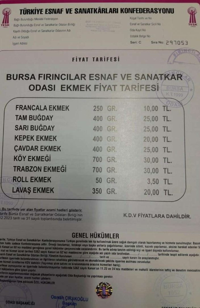 Bursa Fırıncılar Esnaf ve Sanatkarlar Odası tarafından hazırlanan yeni listeyle birlikte il genelinde ekmek fiyatlarının yüzde 12 oranında zamlandığı açıklandı.
