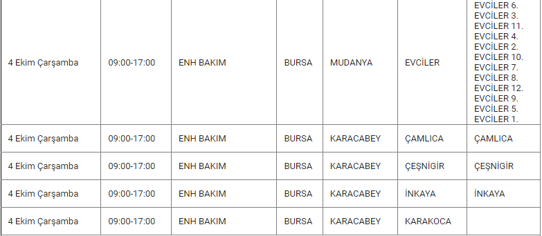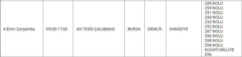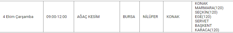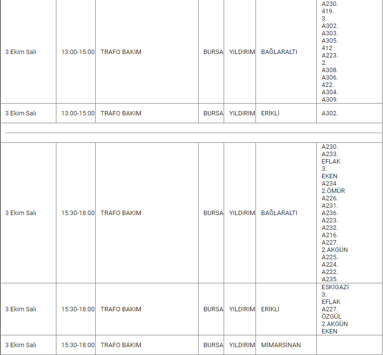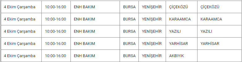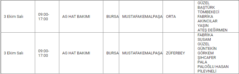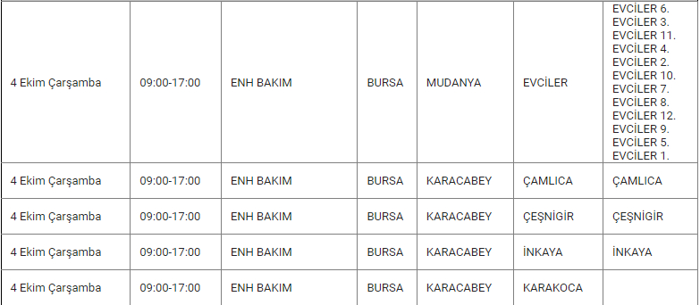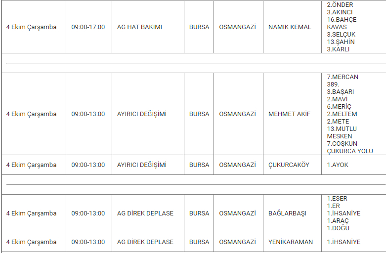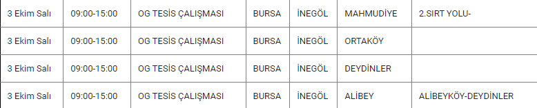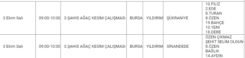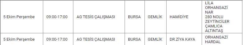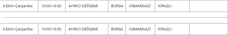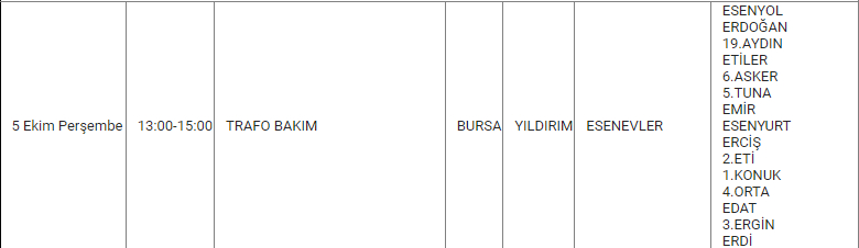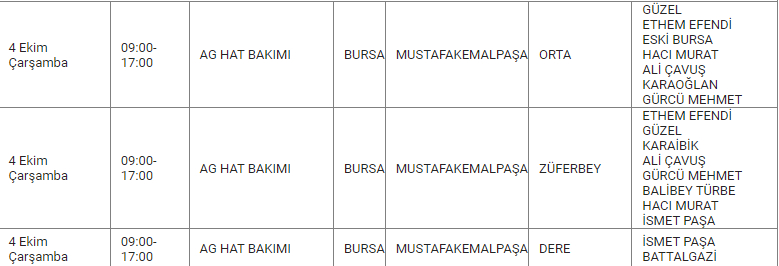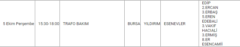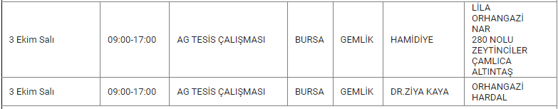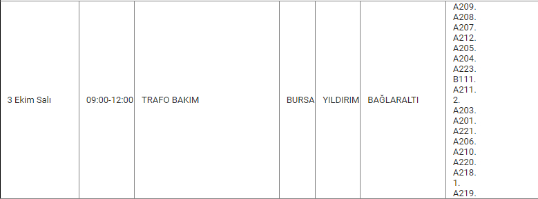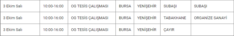 Bursa'da 3, 4 ve 5 Ekim tarihlerinde elektrik kesintisi yapılacak.