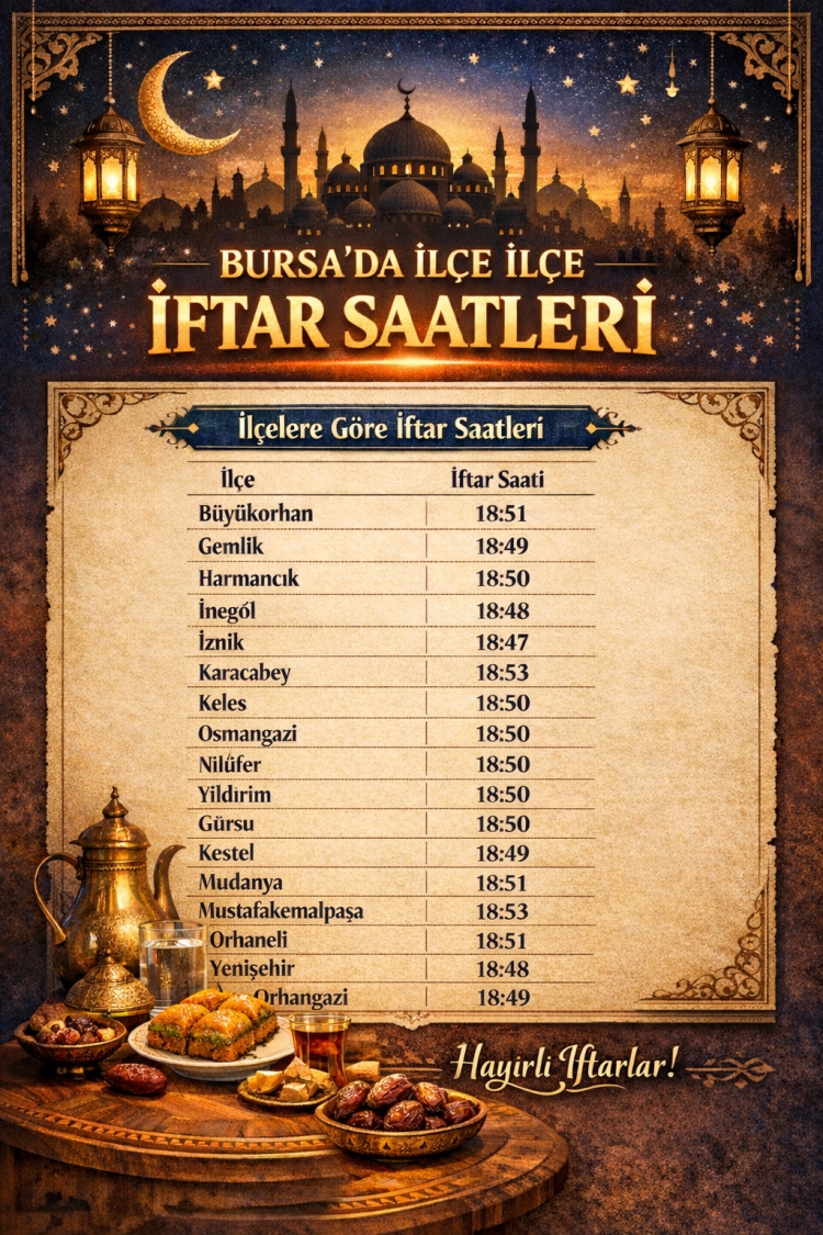 Bursa’da en geç iftar vakti ise 18:53 ile Karacabey ve Mustafakemalpaşa ilçelerinde yaşanacak. Bu ilçelerde yaşayan vatandaşlar, diğer ilçelere göre birkaç dakika daha geç oruçlarını açacak.