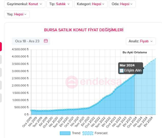 Endeksa verilerine göre Bursa’de satılık konut fiyatlarında artış sürüyor. 2023'ün Ocak ayında 1 milyon 752 bin TL olan ortalama konut fiyatları Aralık ayında 2 milyon 762 bin TL'ye yükseldi.