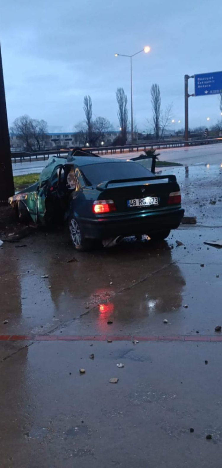 İnegöl yönüne seyreden İmran S. (18) yönetimindeki 48 RG 073 plakalı otomobil, yağışın etkisiyle kayganlaşan yolda kontrolden çıkarak, yol kenarındaki bir mobilya mağazasının beton reklam panosuna çarptı.