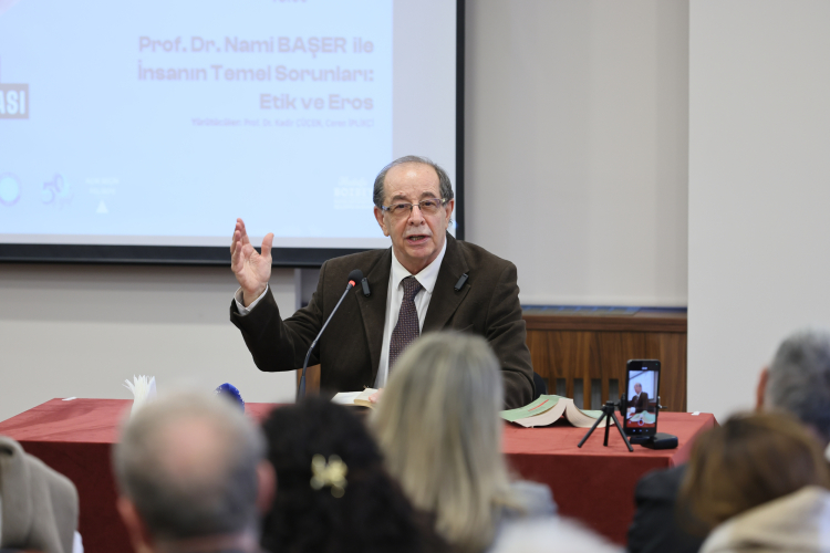 İnsan ve Felsefe’ temalı söyleşinin yürütücülüğünü Prof. Dr. Kadir Çüçen ve Ceren İplikçi üstlendi. Programa konuşmacı olarak katılan Prof. Dr. Nami Başer, ‘İnsanın Temel Sorunları: Etik ve Eros’ başlığında varlığın temel taşlarını felsefi bir bakış açısıyla ele aldı.
