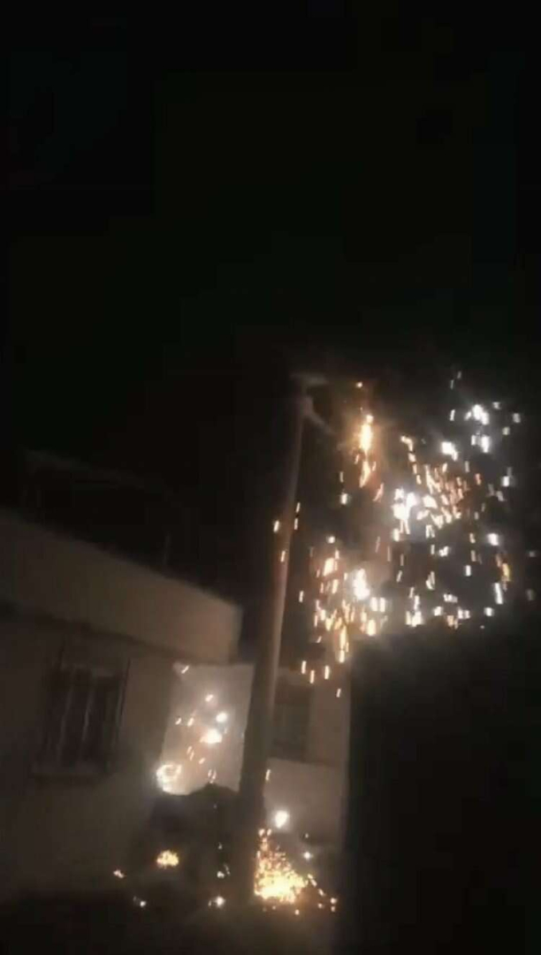 Kuvvetli rüzgarın etkisiyle elektrik direklerindeki tellerin birbirine sürtmesiyle kıvılcımlar etrafa saçıldı.