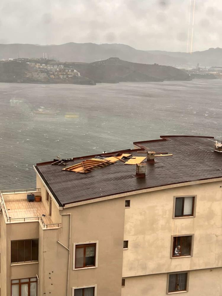 Bursa'nın Gemlik ilçesinde fırtına ve lodos sebebiyle apartmanların çatıları uçarken, ağaçlar ise devrildi.