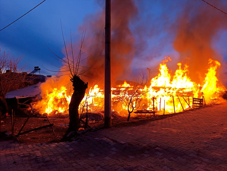 Yangında can kaybı yaşanmazken, ahırda bulunan 150 adet saman balyası küle döndü.