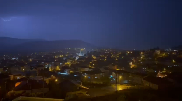 Bursa’nın Orhaneli ilçesinde gök gürültülü sağanak yağış sırasında çakan şimşeklerin geceyi aydınlatması, kameralara yansıdı.