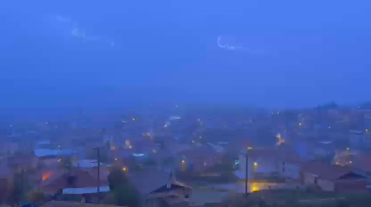 Bursa’nın Orhaneli ilçesinde akşam saatlerinde etkili olan sağanak yağışla birlikte gökyüzünü aydınlatan şimşekler, geceyi gündüze çevirdi.