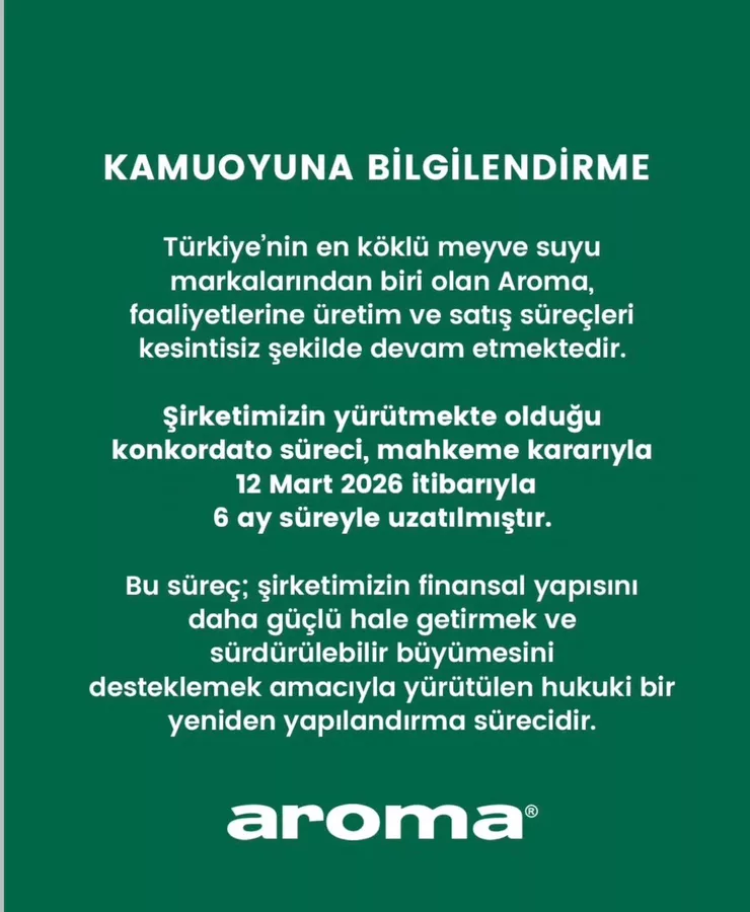 Türkiye’nin ve Bursa’nın köklü meyve suyu markalarından Aroma’nın konkordato sürecinde önemli bir gelişme yaşandı. Mahkeme kararıyla şirkete ek süre verilirken, firma faaliyetlerine kesintisiz devam ettiğini duyurdu.