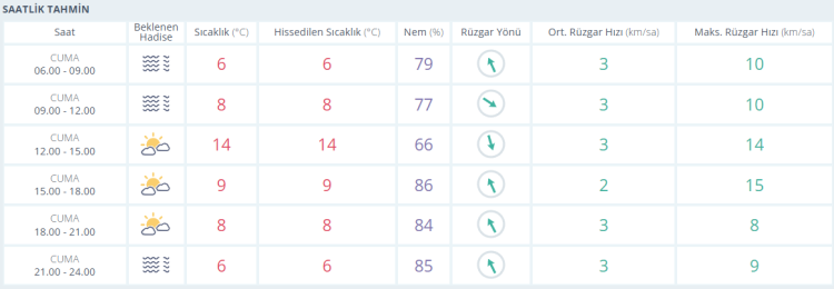 Sıcaklıkların öğle saatlerinde 14 dereceye kadar yükseleceği, akşam saatlerinde 8 dereceye, gece ise 6 dereceye kadar düşeceği öngörülüyor.