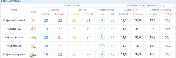 ÇARŞAMBA: Parçalı bulutlu, sıcaklık: 32 derece