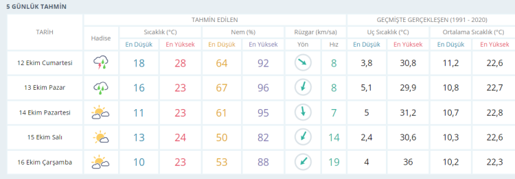 PAZAR sağanak yağışlı23 derece PAZARTESİ parçalı bulutlu ve güneşli 23 derece SALI az bulutlu ve güneşli 24 derece ÇARŞAMBA parçalı bulutlu ve güneşli 23 derece olacak.
