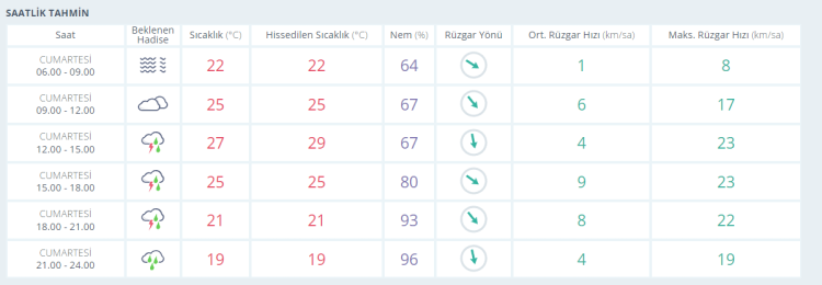 Akşam saatlerine doğru ise termometreler 25 derece olarak ölçülürken gökgürültülü sağanak yağışlı gökyüzüyle birlikte gün batımı yaşanıyor. Akşamsaatlerinde de gökgürültülü sağanak yağışlı havayla birlikte termometreler 21 derece seviyelerinde ölçülüyor. Gece saatlerinde de gökgürültülü sağanak yağışlı havayla birlikte termometreler 19 derece seviyelerine kadar geriliyor.
