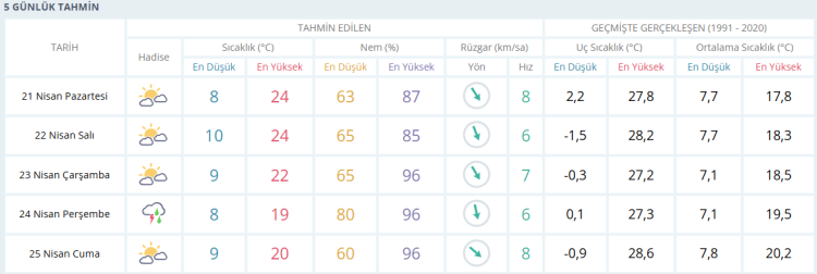SALI parçalı bulutlu ve 24 derece ÇARŞAMBA parçalı bulutlu 22 derece PERŞEMBE gök gürültülü sağanak yağışlı ve 19 derece CUMA parçalı bulutlu 20 derece olması bekleniyor.