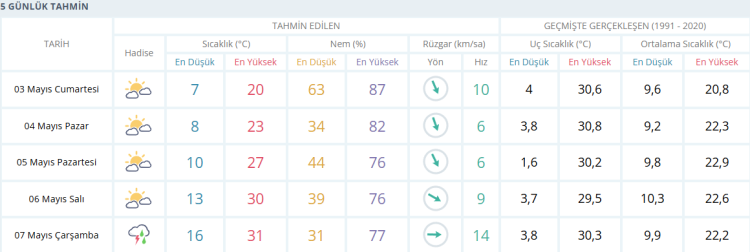 PAZAR parçalı bulutlu ve 23 derece PAZARTESİ parçalı bulutlu 27 derece SALI parçalı bulutlu 30 derece ÇARŞAMBA gök gürültülü sağanak yağışlı 31 derece olması bekleniyor.