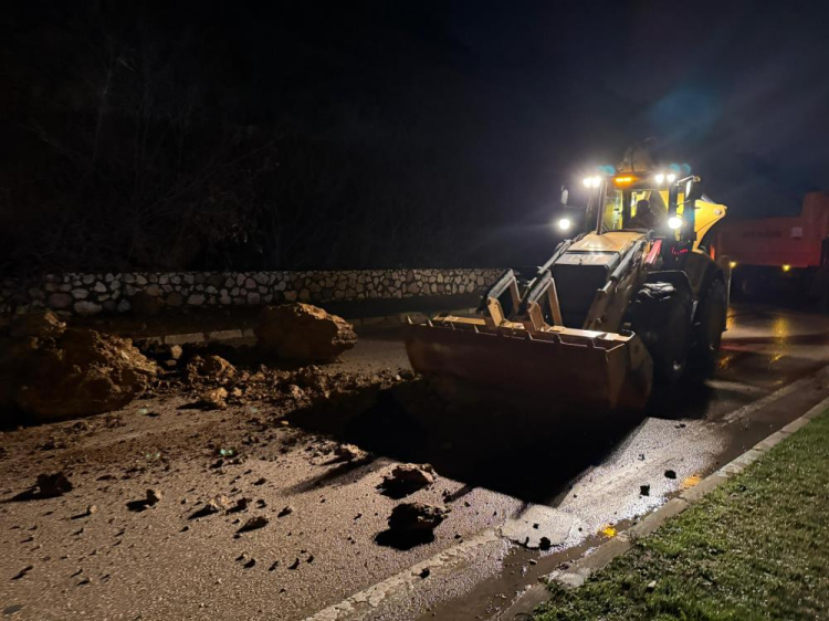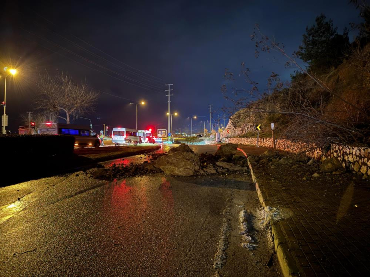 Yola düşen devasa kaya parçaları ve toprak birikintileri sebebiyle kapatılan caddeden geçmek isteyen sürücüler, alternatif yollara yönlendirildi.