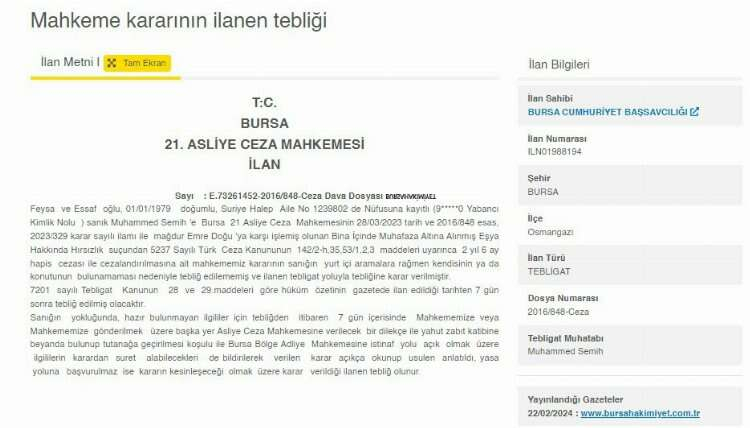 Mahkeme de hapis kararını ilanen tebligat yoluyla tebliğine karar verdi.