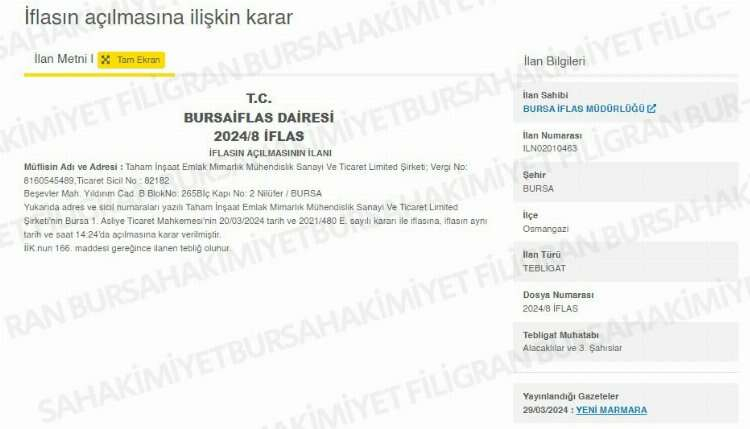 Bursa İflas Müdürlüğü, Taham İnşaat Emlak Mimarlık Mühendislik Sanayi Ve Ticaret Limited Şirketi'nin iflasının açılmasına ilişkin karar yayımladı.