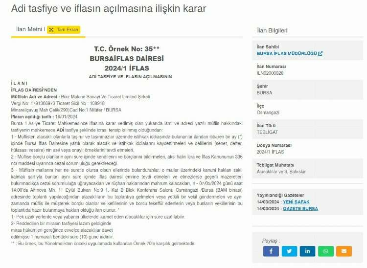 Yapılan açıklamada iflasın açıldığı tarihin 16 Ocak 2024 olduğu belirtildi. Söz konusu duyuruda müftlisten alacaklı olanlara ve borçlulara izlenmesi gereken hukuki yollar hatırlatıldı.