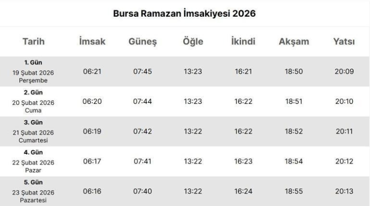 Güneşin doğuş ve batış saatlerine göre her gün yeniden belirlenen vakitlerle hazırlanan Bursa imsakiyesi, sahur (imsak) ve iftar saatlerini en doğru şekilde sunuyor. Diyanet İşleri Başkanlığı verileri esas alınarak oluşturulan bu rehberde, 19 Şubat’ta başlayan ilk oruçtan itibaren 30 gün boyunca Bursa’da sabah ezanının saat kaçta okunacağı ve akşam ezanıyla birlikte iftarın ne zaman yapılacağı gün gün takip edilebilecek. Ayrıca Kadir Gecesi’nin tarihi, Ramazan Bayramı namaz saati gibi önemli gün ve vakit bilgileri de imsakiyede yer alıyor. Böylece Bursa’da Ramazan ayı boyunca sahurdan iftara tüm ibadet planlamanızı kolayca yapabilirsiniz.