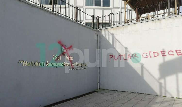 Bursa'da bir lisenin bahçesindeki duvarda bulunan Atatürk büstüne kırmızı boyayla çarpı koyup, 'putlar gidecek' yazdılar.