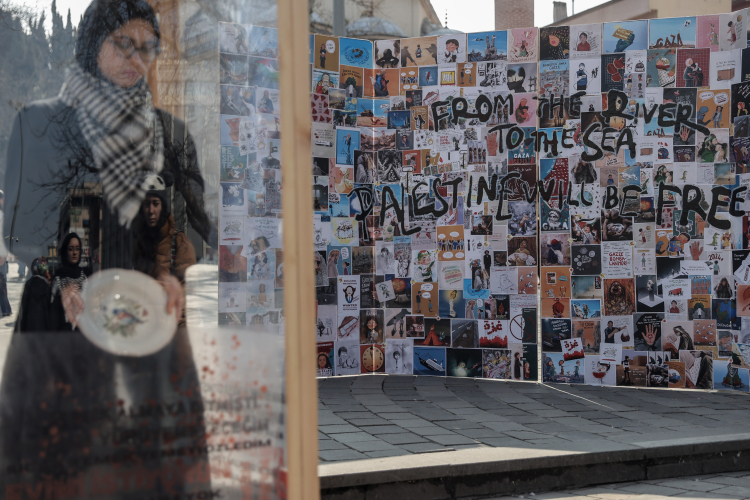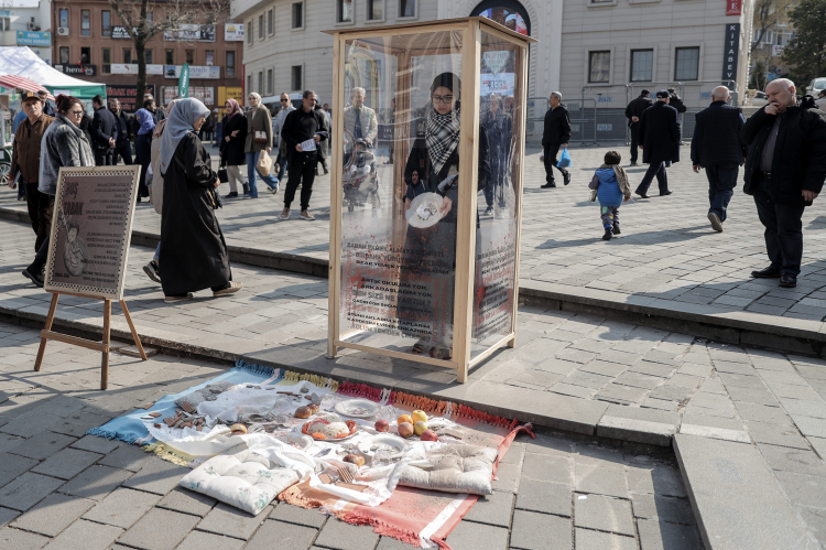 "Bu eylem de onlardan bir tanesi. İnşallah bu eylem insanlarda farkındalık yaratır. Kabinin içinde hiç hareket etmeden, ramazanda Filistinlilerin bir sofrasını canlandırmak ve onların boş tabaklarını anımsatmak, anlatmak için sessiz tiyatro gerçekleştiriyoruz. Orada kardeşlerimizin tabakları boş, sıcak yemeğe ulaşamıyorlar, bunu göstermeye çalıştık."