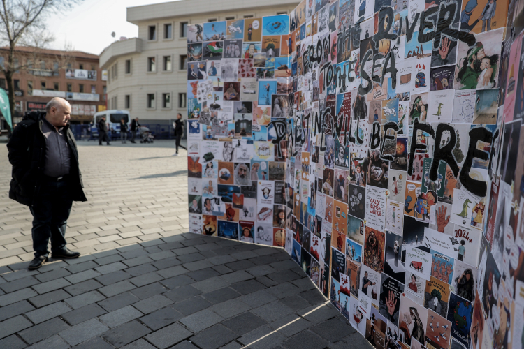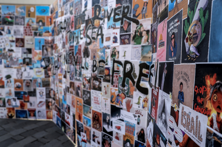 Etkinlikte öğrencilerin resimlerinden oluşturulan panoda da İsrail'in yaptığı katliamlardan kesitler sunuluyor.