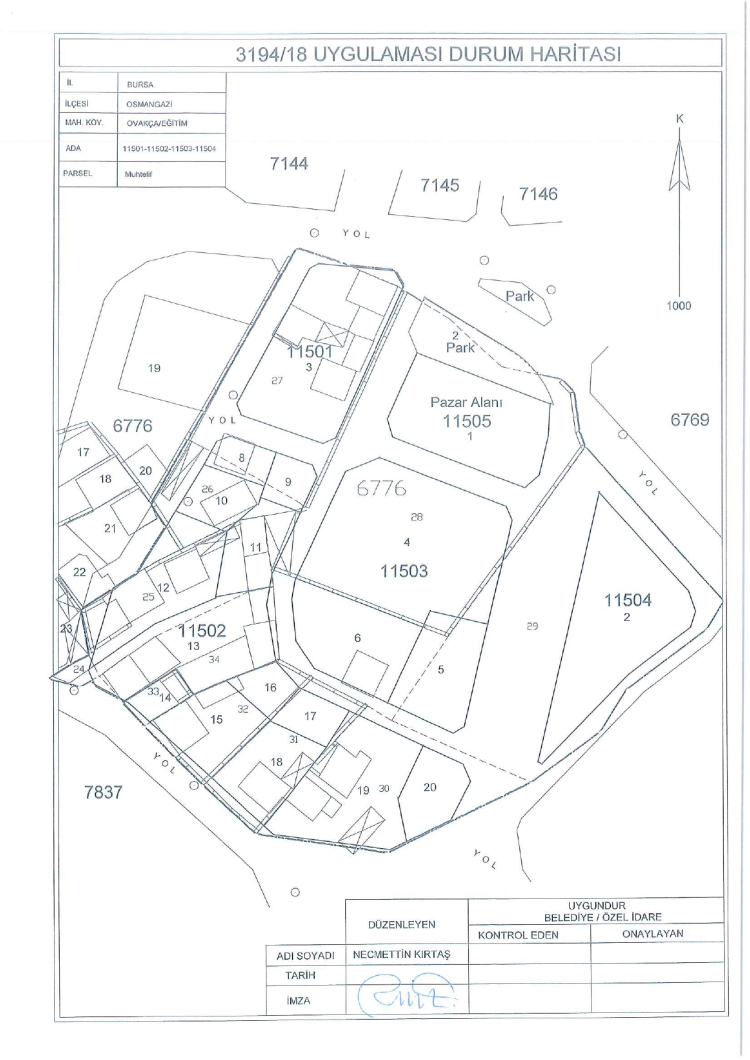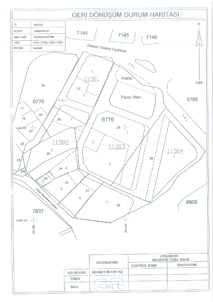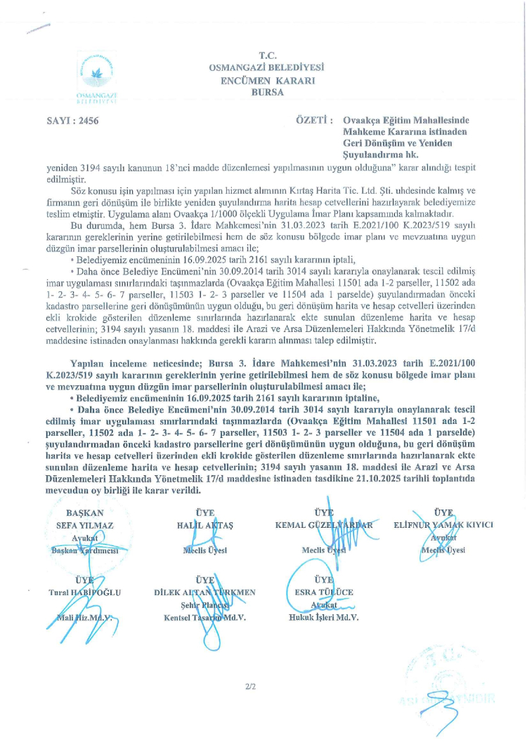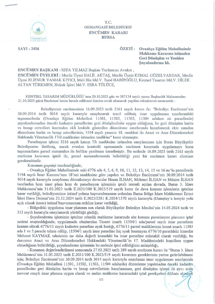 Belediyeden yapılan açıklamada, "Ovaakça Eğitim Mahallesinde daha önce Belediye Encümeni’nin 30.09.2014 tarih 3014 sayılı kararıyla onaylanarak tescil edilmiş imar uygulaması sınırlarındaki taşınmazlarda (Ovaakça Eğitim Mahallesi 11501 ada 1-2 parseller, 11502 ada 1- 2- 3- 4- 5- 6- 7 parseller, 11503 1- 2- 3 parseller, 11504 ada 1 parselde) şuyulandırmadan önceki kadastro parsellerine geri dönüşümü ve bu geri dönüşüm harita ve hesap cetvelleri üzerinden hazırlanan yeni düzenleme harita ve hesap cetvelleri, belediyemiz encümeninin 21.10.2025 tarih 2456 sayılı kararıyla onaylanmıştır. Söz konusu uygulama 01.12.2025 tarihinden itibaren 1 ay süre ile Osmangazi Belediyesi askı ilan panosu, belediyemiz internet sitesi (www.osmangazi.bel.tr) ve Parselasyon İzleme ve Takip Sistemi web adresinde (https://parsid.bulutkbs.gov.tr/ParselasyonBasvuru/#/) askı ilanına çıkarılmıştır. Parsel maliklerine veya mirasçılarına ilanen tebliğ olunur." ifadeleri kullanıldı.