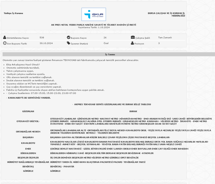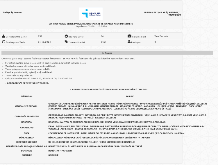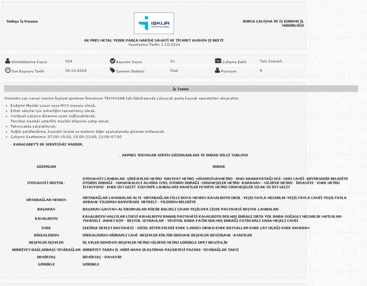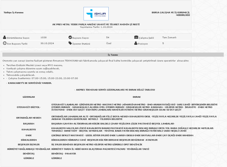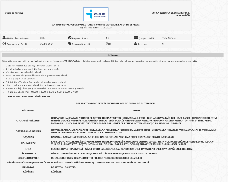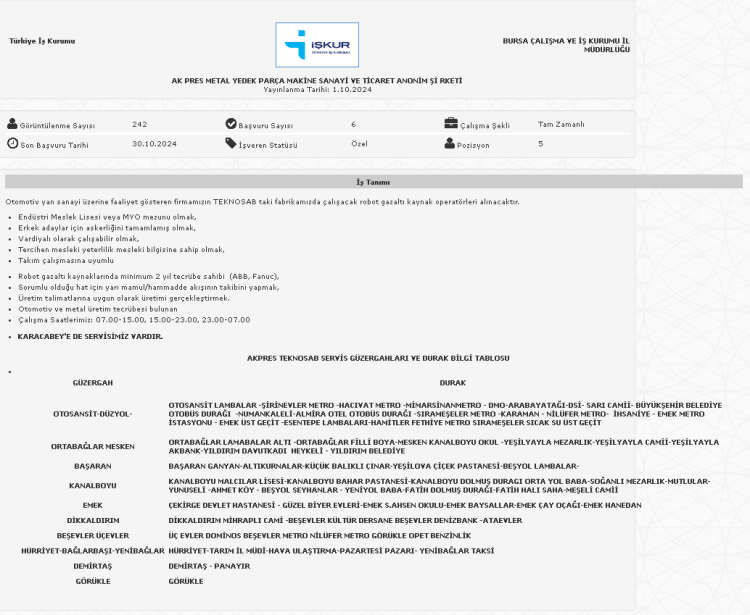 Firma tarafından yayınlanan ilanlarda 'Otomotiv yan sanayi üzerine faaliyet gösteren firmamızın TEKNOSAB'taki fabrikamızda çalışacak deneyimli ya da yetiştirilmek üzere personeller alınacaktır.' ifadeleri yer aldı.