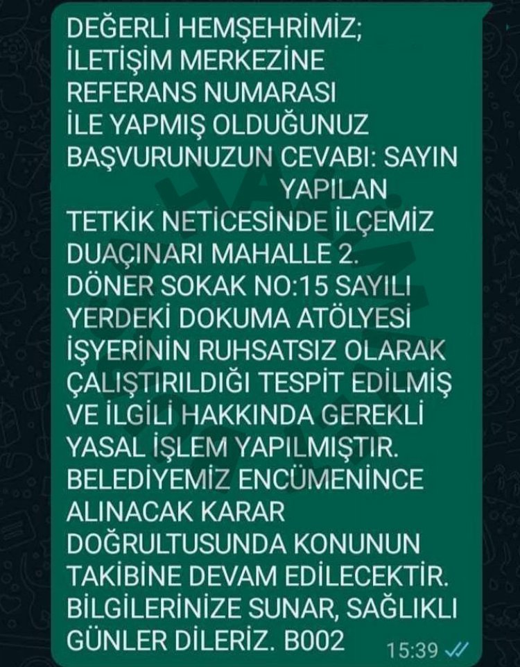 Ayrıca fabrikanın kaçak olarak inşa edildiği ve yapı ruhsatının aykırı olduğu bilgisine sahip olduklarını belirten okur, ruhsat kanun maddesi arasında konuta yakın alanda dokuma fabrikası/atölyesine açıkça ruhsat verilemeyeceğini, bu fabrikanın ruhsat almak ihtimalinin yasalara aykırı olduğunu söyledi.