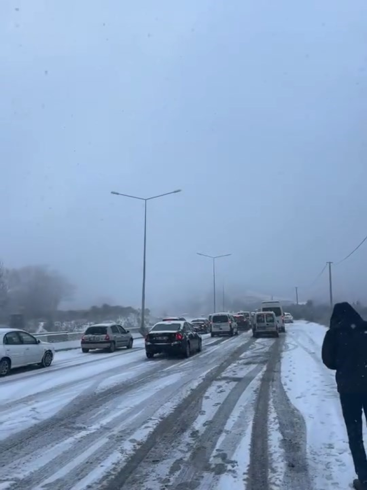 Kar lastiği takılı olmayan araçların bir çoğu yolda kalırken sürücüleri araçlarını yol kenarlarına park edip yollarına yürüyerek devam etti.