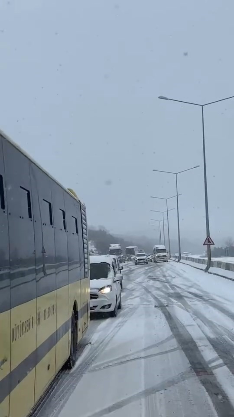 Bursa'da beklenen kar yağışı hızlı başladı. Kapanan yollar sebebiyle sürücüler, ters şeritten dönmek zorunda kaldı.