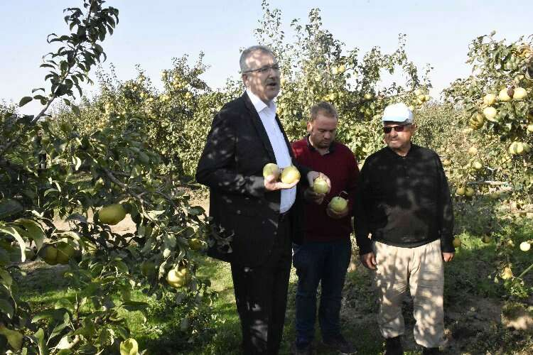“Karacabey böyle verimli toprakları olan bir yer” diyen Özkan,“Salçalık domatesinden mısırına, tohumculuk faaliyetlerinden karpuzuna, kavununa, kapya biberine kadar her çeşit ürün burada yetişiyor. Bunun yanında son zamanlarda da meyveciliğe, alternatif ürünler noktasında yönelmeye başladı çiftçilerimiz. Bugün deveci armut bahçesindeyiz. Ceviz bahçeleri var, Trabzon hurmaları var, elma bahçeleri var, siyah incir çalışmaları var, bunun yanında aromatik ve tıbbi bilgiler üzerine çalışma yapan üreticilerimiz var.Dolayısıyla bizde fırsat buldukça üreticilerimizi ziyaret etmeye çalışıyoruz. Bol ve bereketli bir sezon geçirmenizi diliyoruz” dedi.