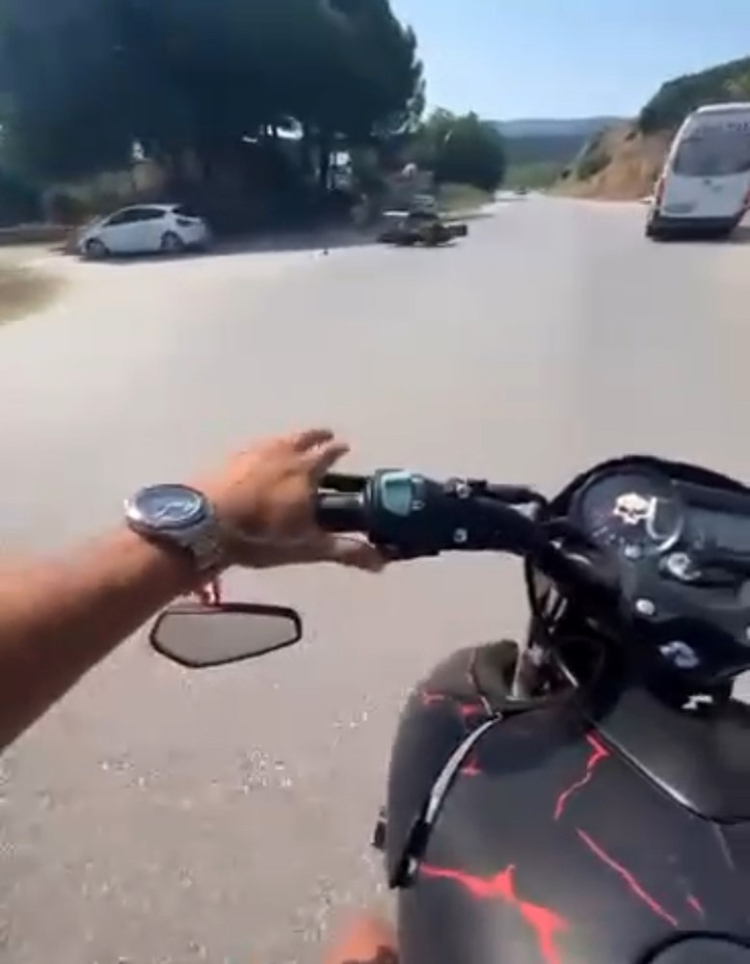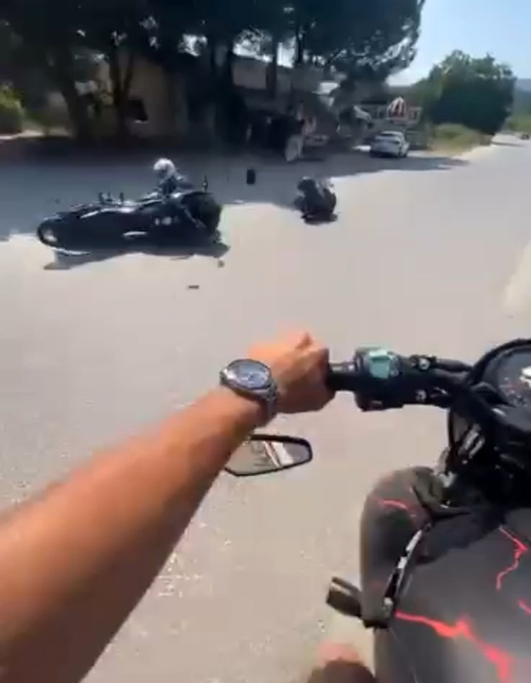 Kaza anı ise aynı yolda seyir halinde olan başka bir motosiklet sürücüsünün kask kamerasına yansıdı.