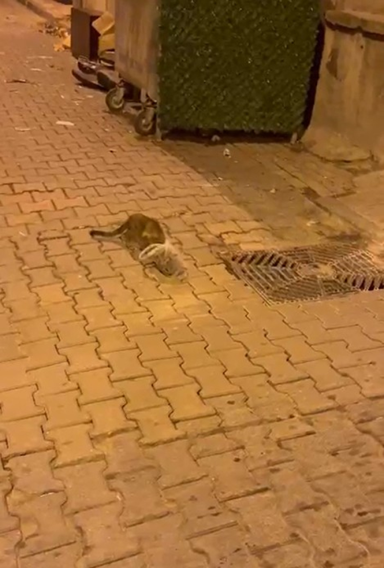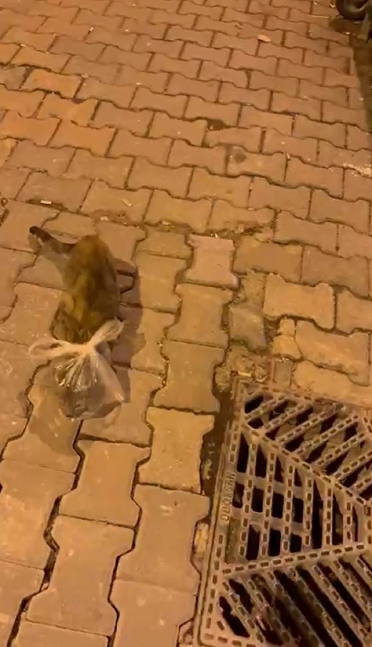 Poşet bağlandığı için çıkaramayan kedinin güçlükle yürüyüp, yönünü bulmaya çalıştı. Durumu fark eden bir esnaf, korkup kaçmaya çalışan kediyi yakalayıp, başındaki poşeti çıkardı. Kediyi iş yerine getiren esnaf, yaşananları cep telefonu kamerasıyla görüntüledi.