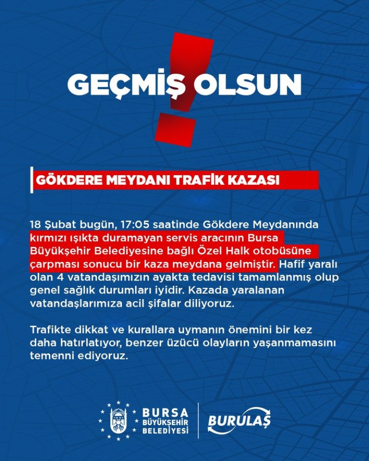 18 Şubat bugün, 17:05 saatinde Gökdere Meydanında kırmızı ışıkta duramayan servis aracının Bursa Büyükşehir Belediyesine bağlı Özel Halk otobüsüne çarpması sonucu bir kaza meydana gelmiştir. Hafif yaralı olan 4 vatandaşımızın ayakta tedavisi tamamlanmış olup genel sağlık durumları iyidir. Kazada yaralanan vatandaşlarımıza acil şifalar diliyoruz.Trafikte dikkat ve kurallara uymanın önemini bir kez daha hatırlatıyor, benzer üzücü olayların yaşanmamasını temenni ediyoruz.