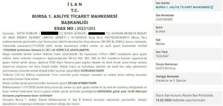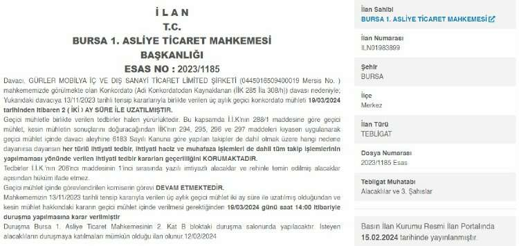 Bursa 1. Asliye Ticaret Mahkemesi, Bursa'da faaliyet gösteren Gürsan Mobilya İnşaat Ve Gıda Sanayi Ticaret Limited Şirketi ve Gürler Mobilya İç Ve Dış Sanayi Ticaret Limited Şirketi'nin üç aylık geçici konkordato mühletinin 2 ay daha uzatıldığını duyurdu.