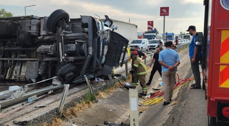 Bursa-Balıkesir karayolunda kontrolden çıkan kamyonun devrildiği kazada sürücüsü yaralandı.