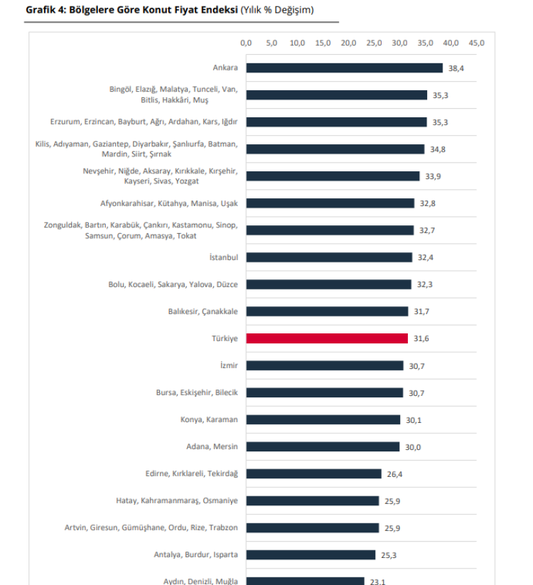 İstatistiki Bölge Birimleri Sınıflamasına göre bölgelerin yıllık konut fiyat endeksi değişimleri incelendiğinde, Ekim 2025 döneminde en yüksek yıllık artış yüzde 38,4 ile Ankara bölgesinde, en düşük yıllık artış ise yüzde 23,1 ile Aydın, Denizli, Muğla bölgesinde gözlendi.