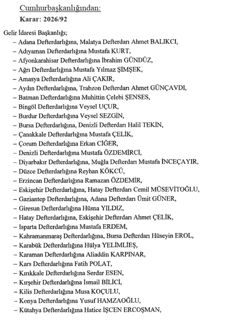 Cumhurbaşkanlığı tarafından yapılan atamalara ilişkin kararlara göre, Hazine ve Maliye Bakanlığı Gelir İdaresi Başkanlığınca aralarında Bursa'nın da bulunduğu 44 ilin defterdarlıklarına atama yapıldı.