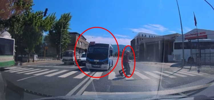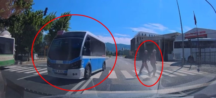 Bursa'da, yolcu minibüsünün şoförü, kırmızı ışıkta duran araçları ters şeritten geçip, yolun karşısına geçen yayalara aldırış etmeden ilerledi. O anlar, araç kamerasına yansıdı.