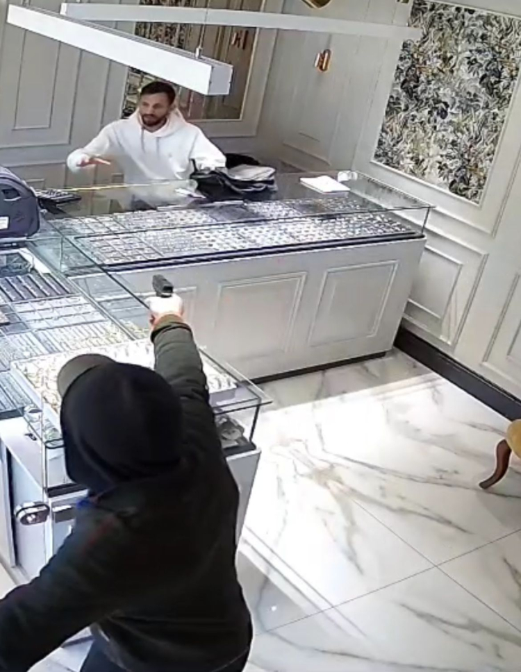 Altınları doldurmasını isteyen kuyumcuyla bağrışan soyguncu, kuyumcunun arka bölümden içeri giren kardeşinin "sakin sakin" demesine aldırmadı.