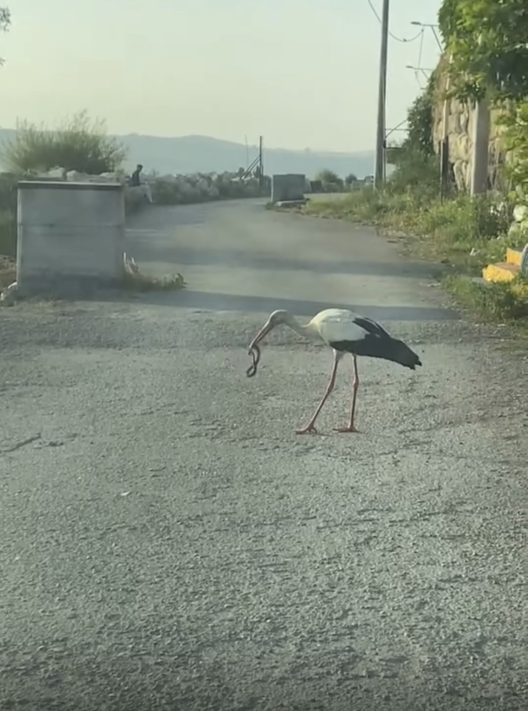 Leylek köyü Karaağaç'ta bir leylek gördüğü yılanı tek hamle ile midesine indirdi. O anlar bir vatandaş tarafından saniye saniye kayda alındı.