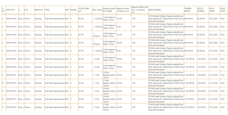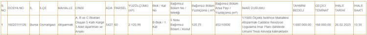 Maliye'nin Yıldırım ilçesi Umurbey mahallesinde bulunan lojman daireleri için ise 800 bin TL ile 1 milyon 520 bin TL arasında muhammen bedeller belirlendi.