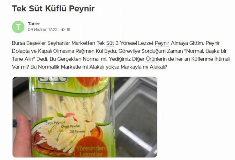 Nilüfer'deki şubeden peynir alan müşteri, ürünün dolapta ve kapalı olmasına rağmen küflü olduğunu öne sürdü.Küflü üründen görevliye bahsedince, "Normal. Başka bir tane alın" yanıtını aldığını ifade eden müşteri, "Bu gerçekten normal mi, yediğimiz diğer ürünlerin de her an küflenme ihtimali var mı? Bu normallik marketle mi alakalı yoksa markayla mı alakalı?" diyerek tepkisini dile getirdi.
