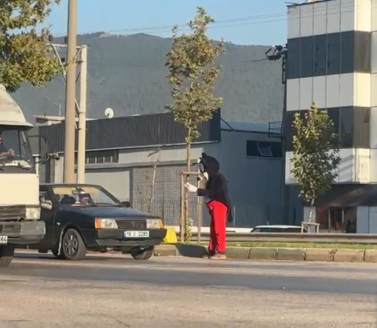 Bursa'nın Kestel ilçesinde, şehirlerarası yolda Miki Fare kostümü ile peçete satan kişi, sürücülerin ilgi odağı oldu.