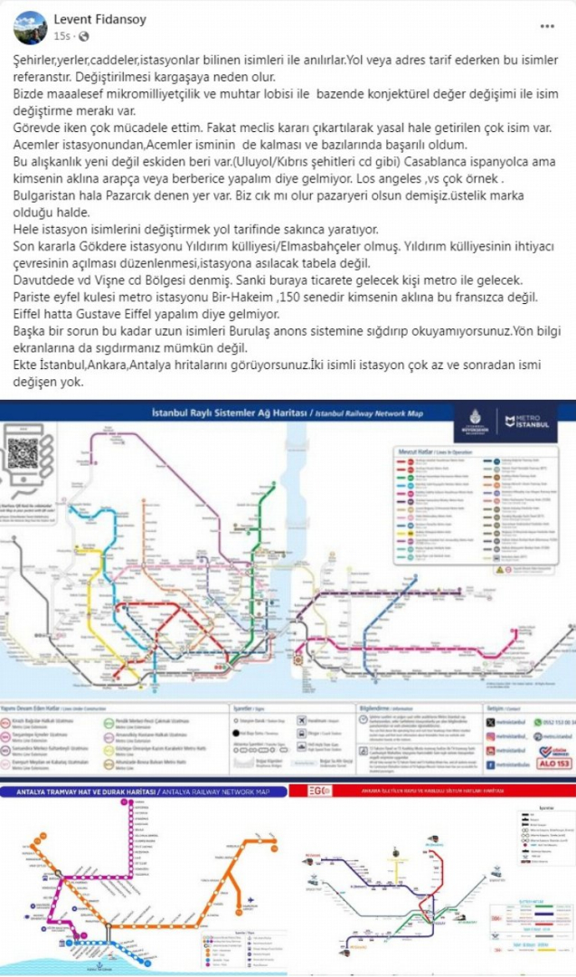 Paris'te, Eyfel Kulesi metro istasyonu Bir-Hakeim,150 senedir kimsenin aklına bu Fransızca değil. Eiffel hatta Gustave Eiffel yapalım diye gelmiyor. Başka bir sorun bu kadar uzun isimleri Burulaş anons sistemine sığdırıp okuyamıyorsunuz. Yön bilgi ekranlarına da sığdırmanız mümkün değil. Ekte İstanbul, Ankara, Antalya haritalarını görüyorsunuz.İki isimli istasyon çok az ve sonradan ismi değişen yok.