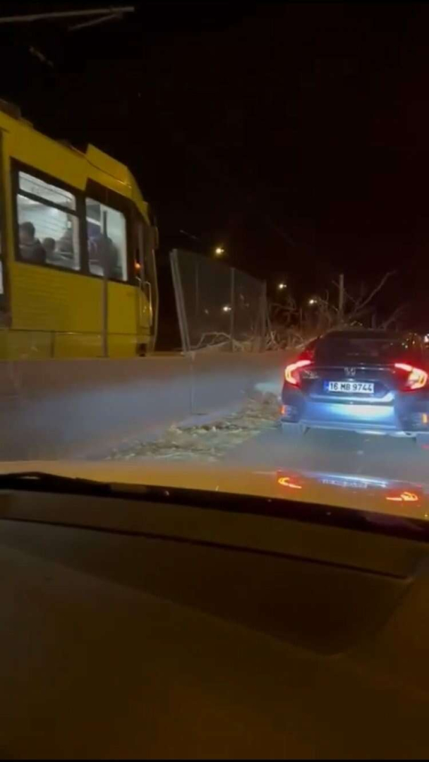 Bursa’da gece saatlerinde etkisini iyice artıran şiddetli lodos nedeniyle metro raylarına ağaç devrildi.