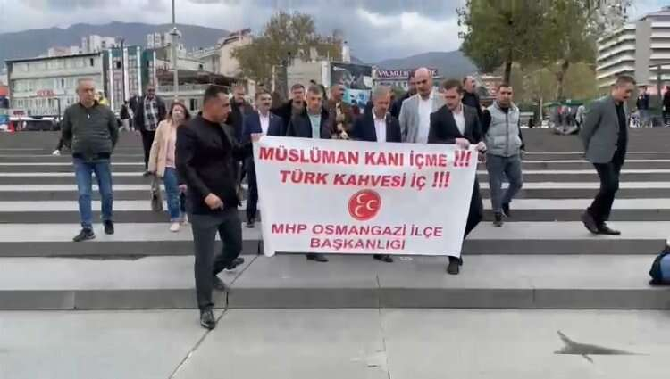 Bursa'da toplanan MHP Osmangazi İlçe Başkanlığı üyeleri, ellerindeki Türk kahveleriyle gençlerin yayına gitti. Açtıkları pankartla, 'Müslüman kanı içme. Türk kahvesi iç' mesajı verdi.