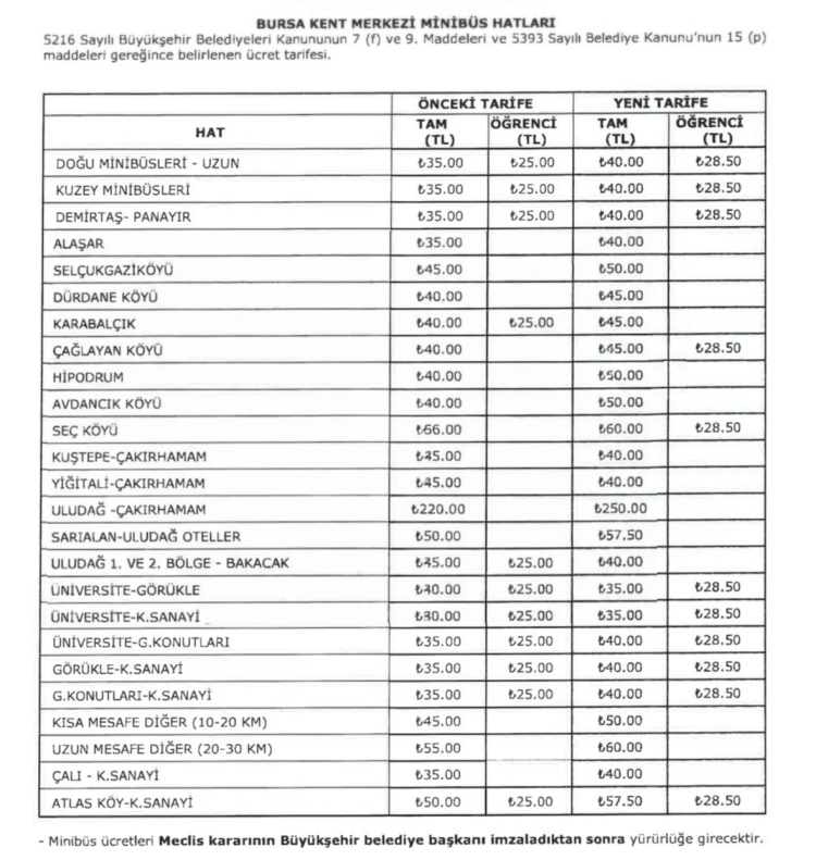 Doğu minibüsleri (uzun), Kuzey minibüsleri ile Demirtaş–Panayır hatlarında tam ücret 35 liradan 40 liraya, öğrenci ücreti ise 25 liradan 28,50 liraya yükseltildi.