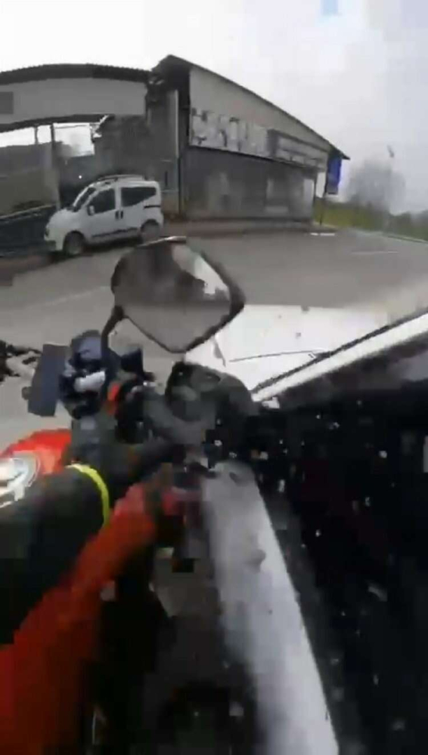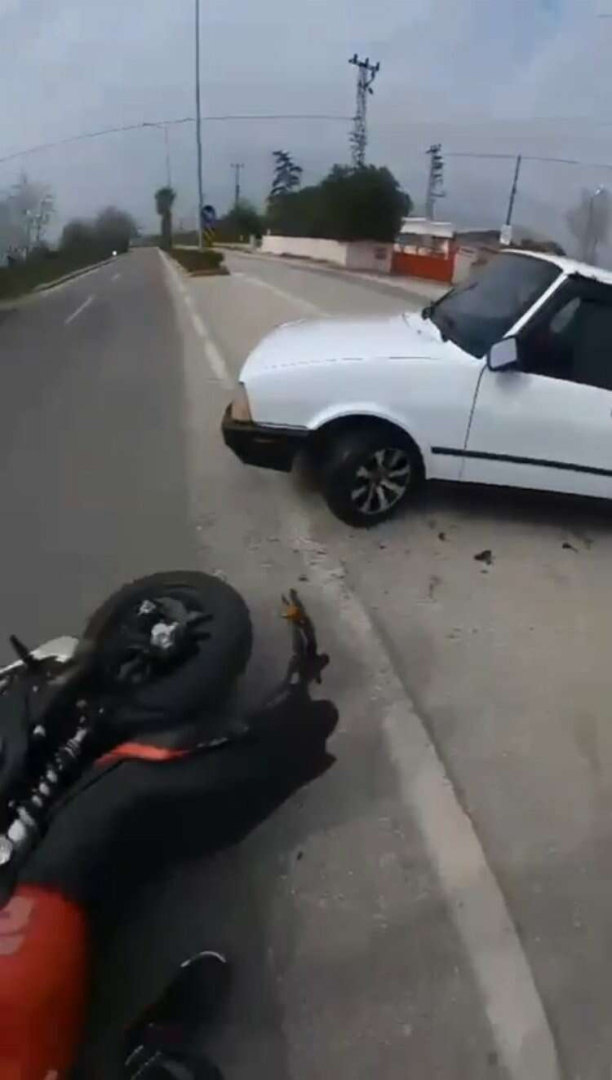 Yerden kendi çabalarıyla kalkan motosikletli, otomobil sürücüsüne tepki gösterirken, kaza anı kask kamerasına saniye saniye yansıdı.